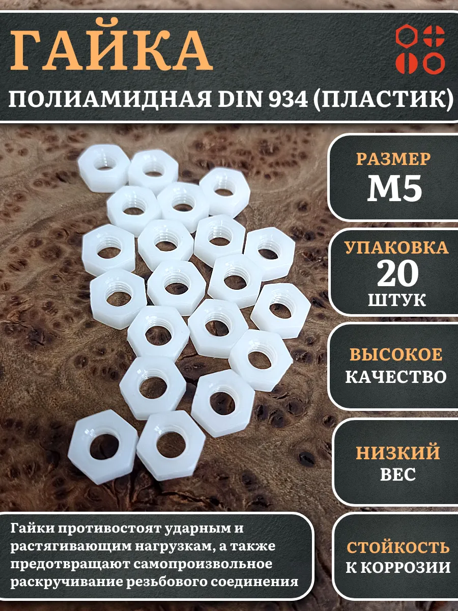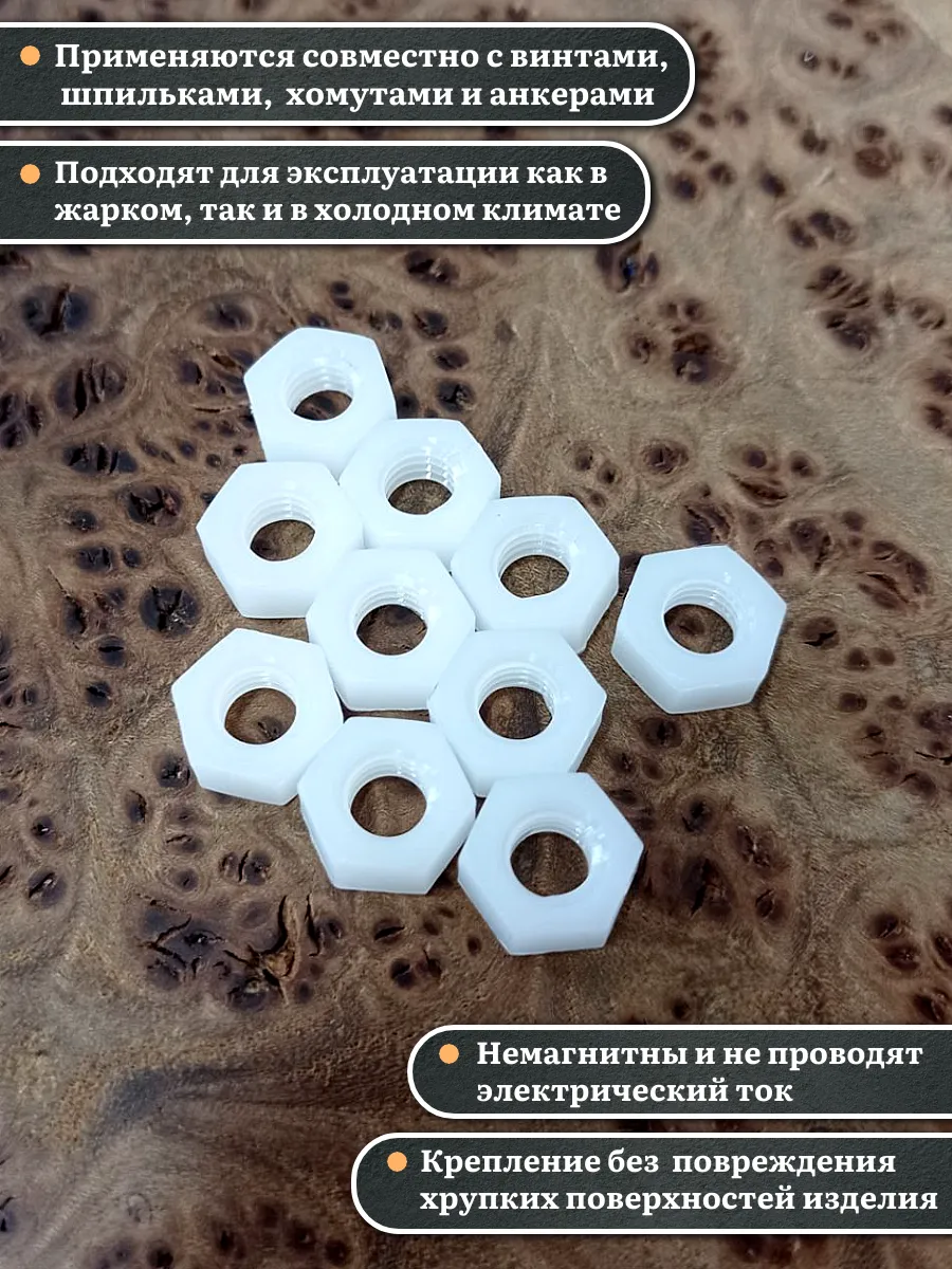 Гайки из пластика, изготовленные из полиамида и соответствующие стандарту DIN 934, используются для предотвращения самопроизвольного раскручивания резьбовых соединений. Вместе с ними применяют полиамидные шайбы, которые служат в качестве уплотнительной прокладки. Это позволяет увеличить площадь контакта и защитить соединяемые детали от повреждений.