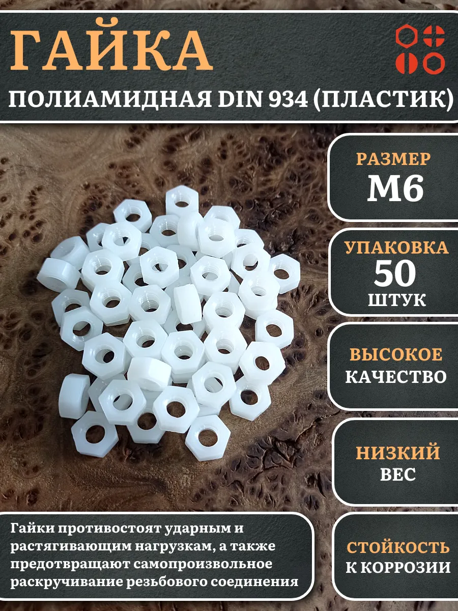 Гайка полиамидная М6 DIN934 (пластик), 50 шт.