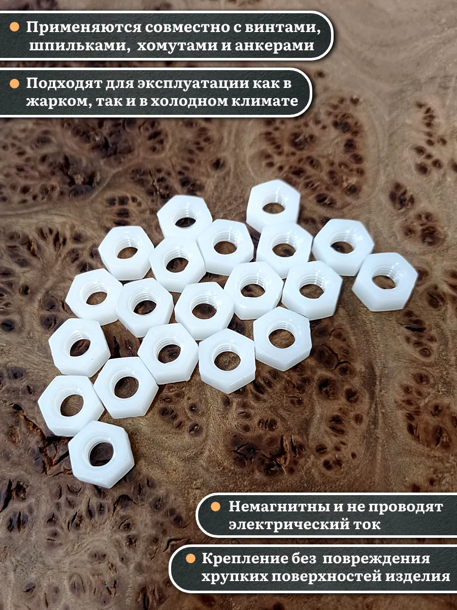 Гайки из пластика, изготовленные из полиамида и соответствующие стандарту DIN 934, используются для предотвращения самопроизвольного раскручивания резьбовых соединений. Вместе с ними применяют полиамидные шайбы, которые служат в качестве уплотнительной прокладки. Это позволяет увеличить площадь контакта и защитить соединяемые детали от повреждений.