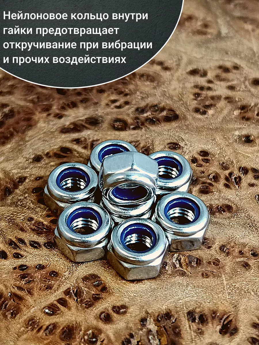 Стопорная самоконтрящаяся гайка DIN 985 с нейлоновым кольцом из нержавеющей стали А2 используется в машиностроении, приборостроении и прочих промышленных, производственных, строительных отраслях совместно с болтами, винтами или шпильками соответствующего размера резьбы.