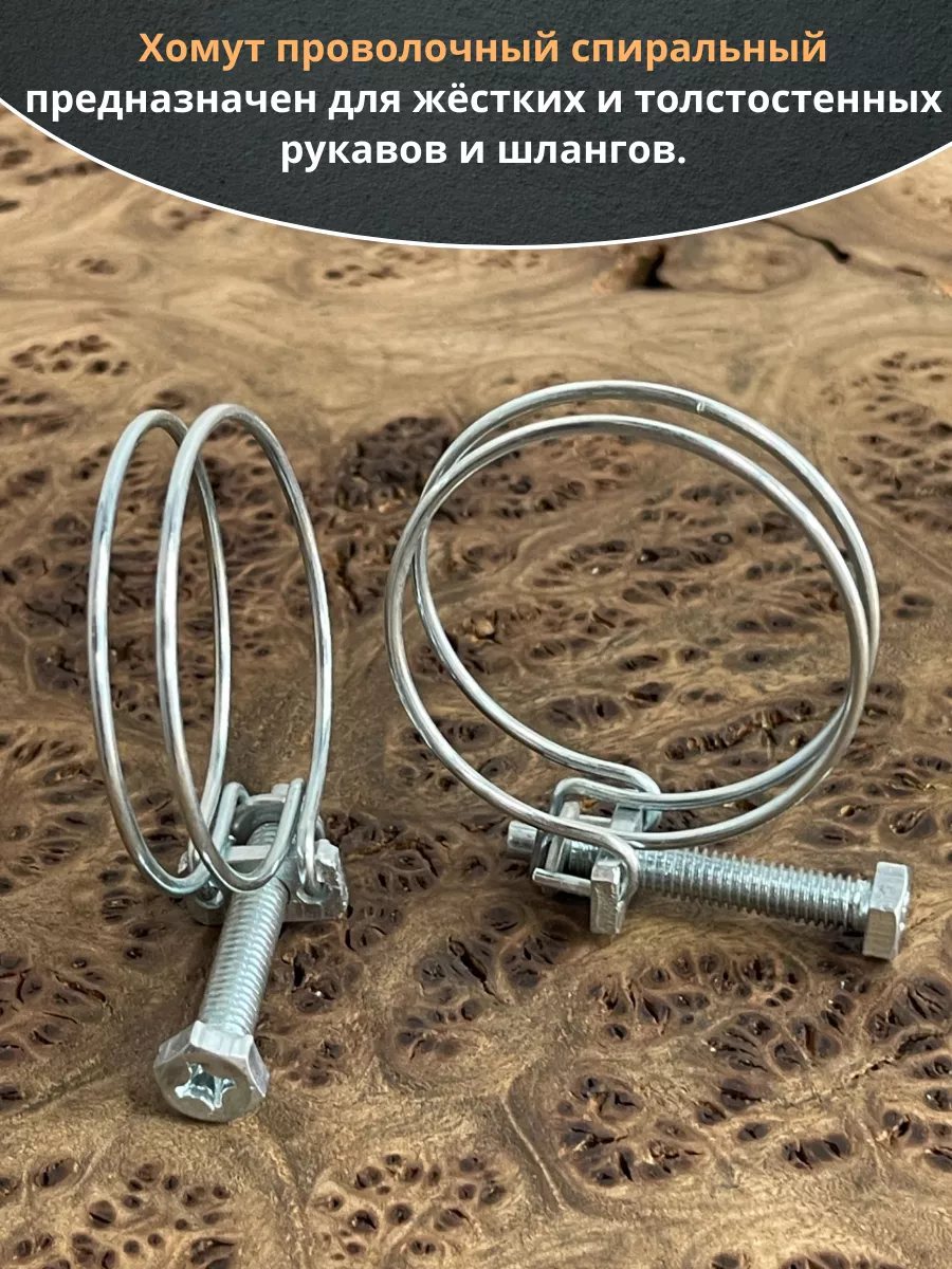 Проволочный хомут (оцинкованный) предназначен для крепления шлангов со спиральным армированием и толстостенных жестких рукавов, работающих в условиях повышенной вибрации. Выполнен из проволоки в виде двух витков спирали с замком. Благодаря такой конструкции он отлично ложится в выемку спирально-армированного шланга. Способен обеспечивать максимальную степень сжатия при минимальной площади давления. Изготовлен из углеродистой стали W1 с цинковым покрытием толщиной не менее 6 мкм. Применяется в автомобилестроении для соединения контуров системы охлаждения с патрубками или в быту для присоединения к трубам шлангов высокой плотности. Монтируется обычным гаечным ключом путем закручивания затягивающего болта. При использовании пружинного проволочного хомута следует учесть тот факт, что давление от него приходится на малую площадь, поэтому есть риск сильно передавить и этим травмировать материал. Чтобы этого не произошло, необходимо в процессе монтажа контролировать степень сжатия.