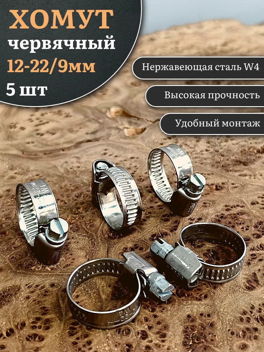 Хомут стяжка червячный 12-22/9 W4 нержавейка, 5 шт.