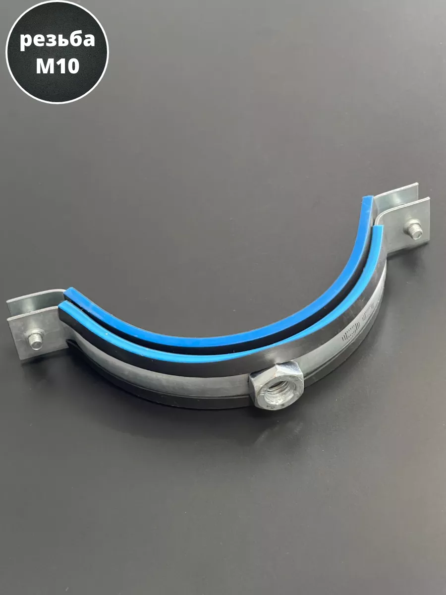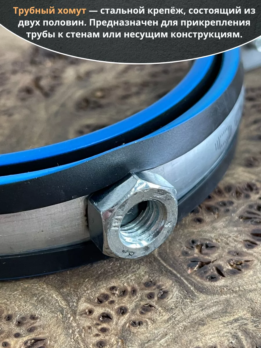 Хомут изготавливается из стали, прокладка - из высококачественной резины. Все металлические детали в обязательном порядке оцинковываются. С помощью трубного хомута трубы могут фиксироваться на полу, стенах или потолке. Данный вид хомута предназначен для надежного крепежа трубопроводов. Используется в сантехническом деле. Пользуется большой популярностью, за счет гарантии надежной фиксации. Материал основания: древесина, металл, бетон, кирпич