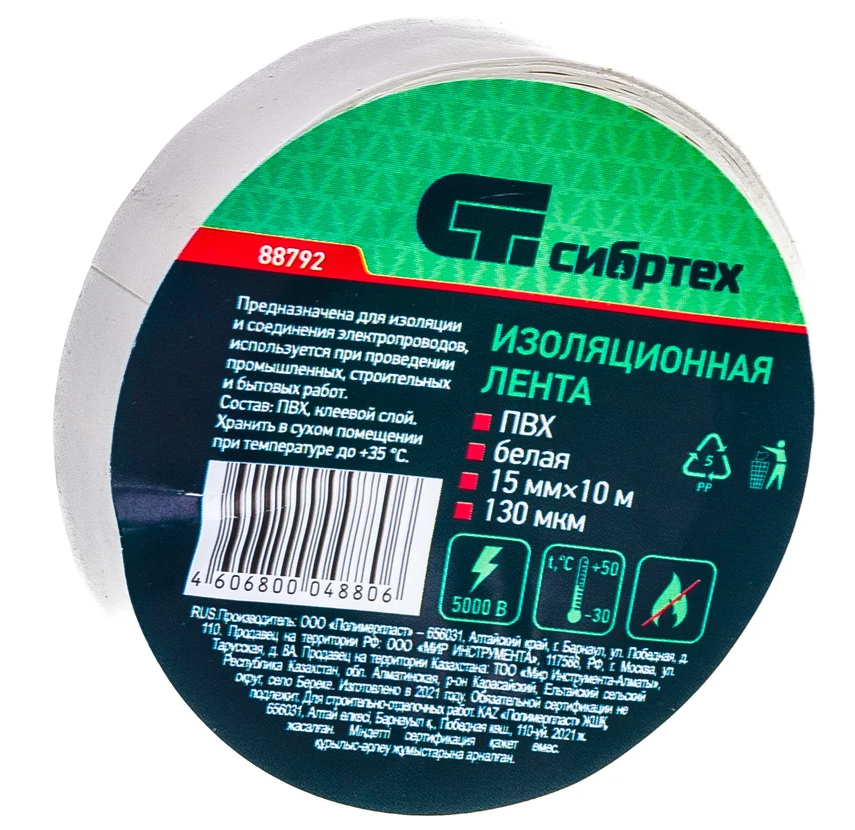 Изолента ПВХ 15 мм х 10 м (белая) Сибртех находит широкое применения как в быту, так и на промышленных объектах. С ее помощью можно выполнить электромонтажные работы: изоляцию, жгутирование и соединение проводов, а также цветовую маркировку. Преимущества Лента позволяет получить безопасные соединения, т.к. не поддерживает горение и может использоваться в диапазоне от -30 до +50 градусов Цельсия. Благодаря толщине 130 мкм изолента выдерживает рабочее напряжение до 5000 В. Акриловая клеевая основа обладает высокими показателями адгезии, поэтому лента не отклеится даже через долгое время. ПВХ лента отличается прочностью и эластичностью, а также стойкостью к истиранию, воздействию УФ-лучей и влаги, что повышает ее ресурс. Биоразлагаемая бумажная катушка утилизируется без вреда для экологии. Длина ленты составляет 10 метров, поэтому ее хватит на большой объем работ.