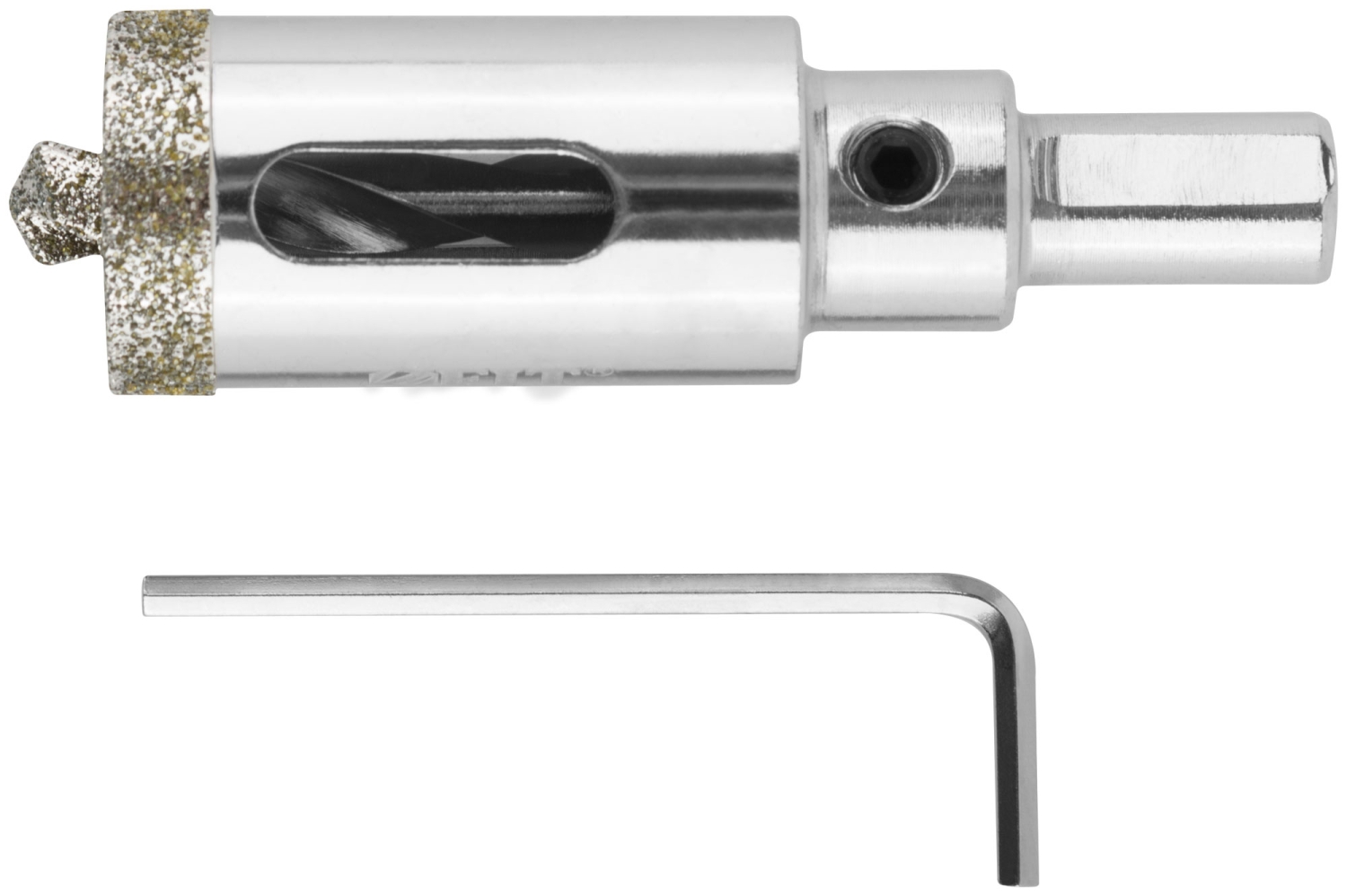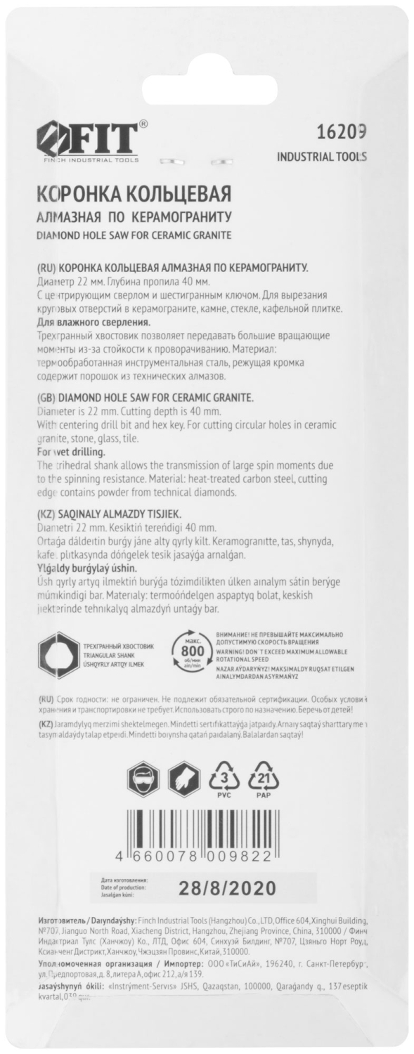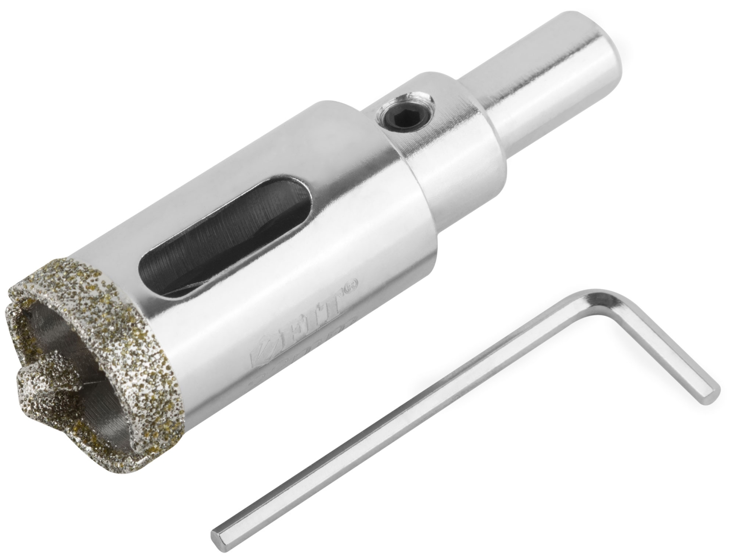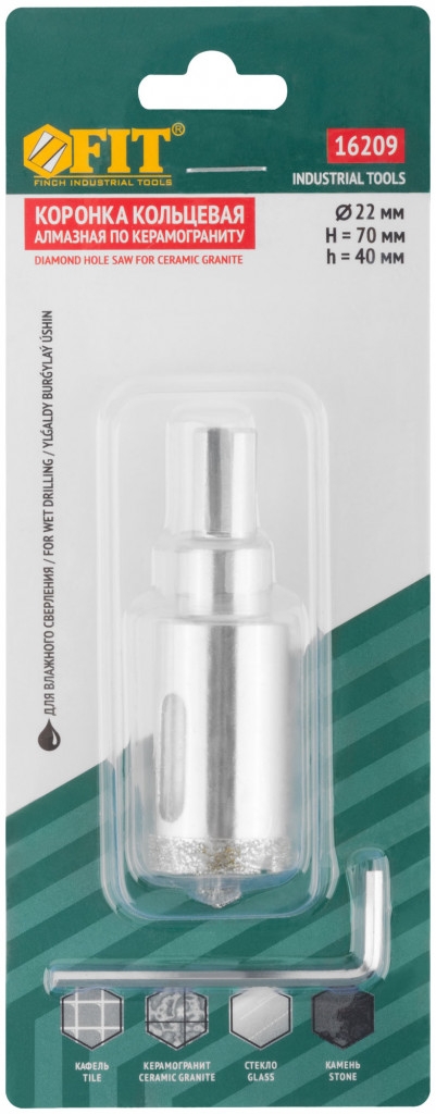 Трехгранный хвостовик. Идут в комплекте с центрирующим сверлом и шестигранным ключом. Для вырезания круговых отверстий в керамограните, камне, стекле, кафельной плитке. Влажное сверление. Глубина пропила 40 мм. Материал: инструментальная сталь, режущая кромка содержит порошок из технических алмазов. Упаковка: блистер.