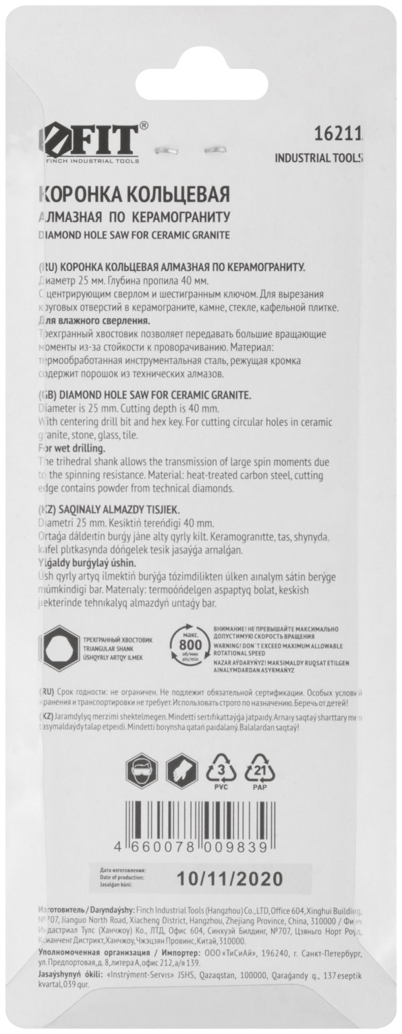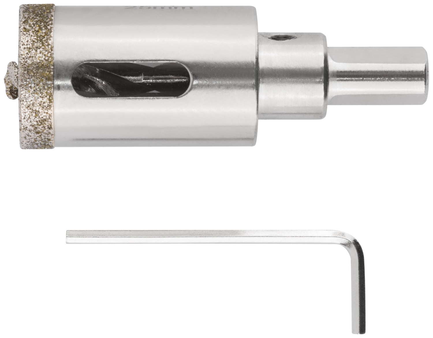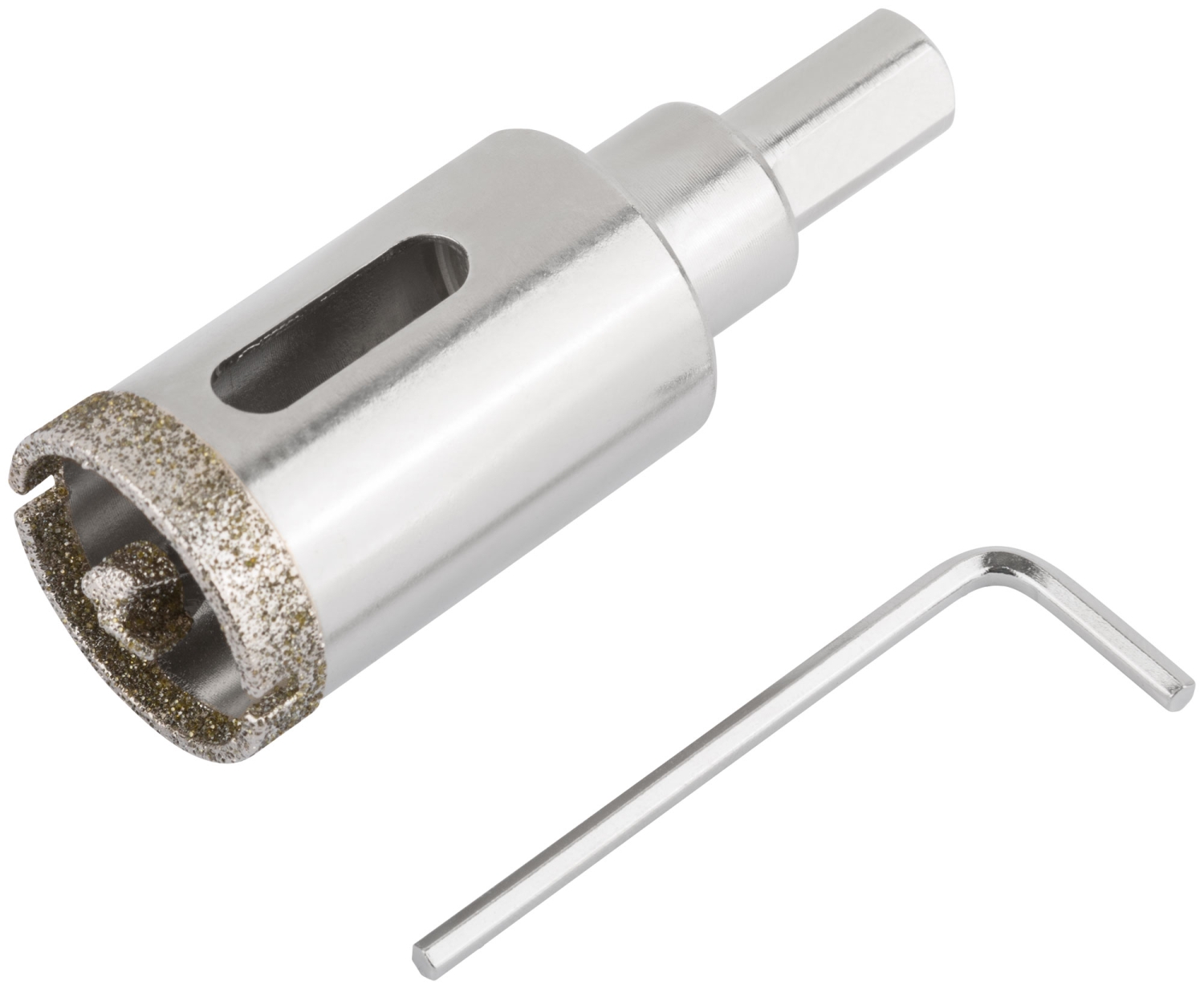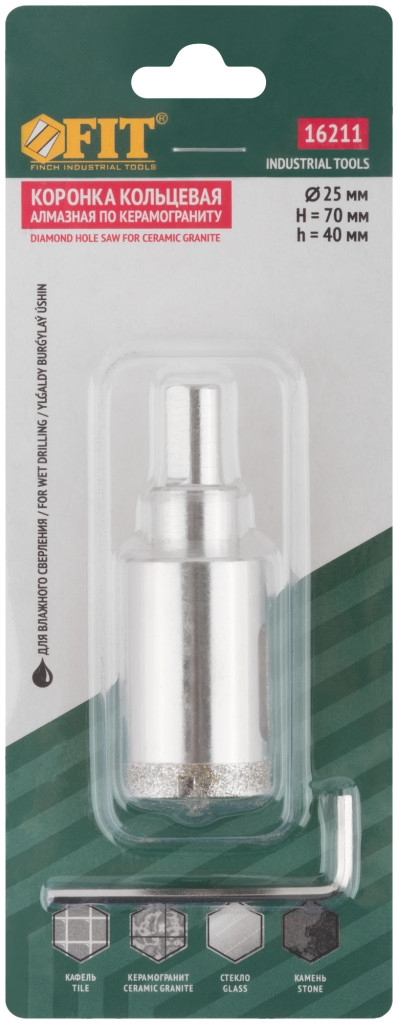 Трехгранный хвостовик. Идут в комплекте с центрирующим сверлом и шестигранным ключом. Для вырезания круговых отверстий в керамограните, камне, стекле, кафельной плитке. Влажное сверление. Глубина пропила 40 мм. Материал: инструментальная сталь, режущая кромка содержит порошок из технических алмазов. Упаковка: блистер.