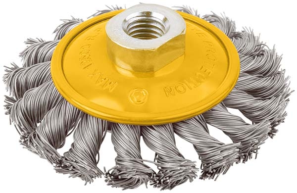 Тип «колесо», с наклоном, гайка М14. Для УШМ. Повышенная износостойкость. Материал: витая проволока из нержавеющей стали, основа из инструментальной стали. Упаковка: картонная коробка.