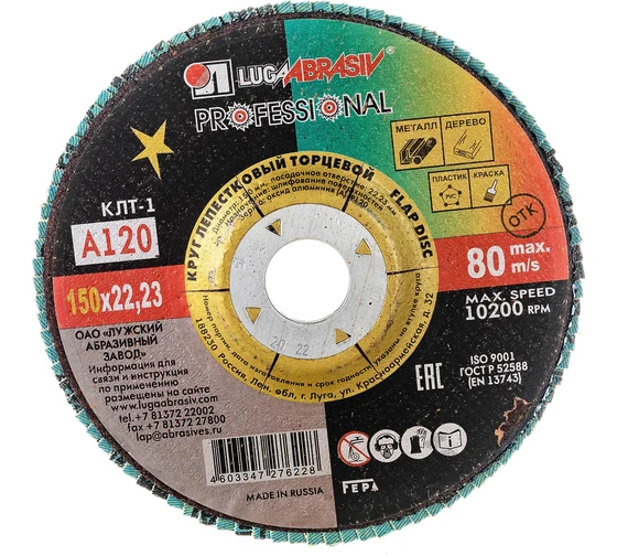 Круг лепестковый торцевой плоский КЛТ1 (150х22 мм; А120; 14А 12/Р120) Луга D91015022140120 предназначен для ручных шлифовальных машин. Применяется для плоского шлифования, обработки кромок и сварных швов деталей и конструкций из различных марок сталей, цветных металлов и древесины. Круг работает тихо, устойчиво, без прижогов, оставляя холодными обработанные поверхности, обеспечивает максимальный съем материала.