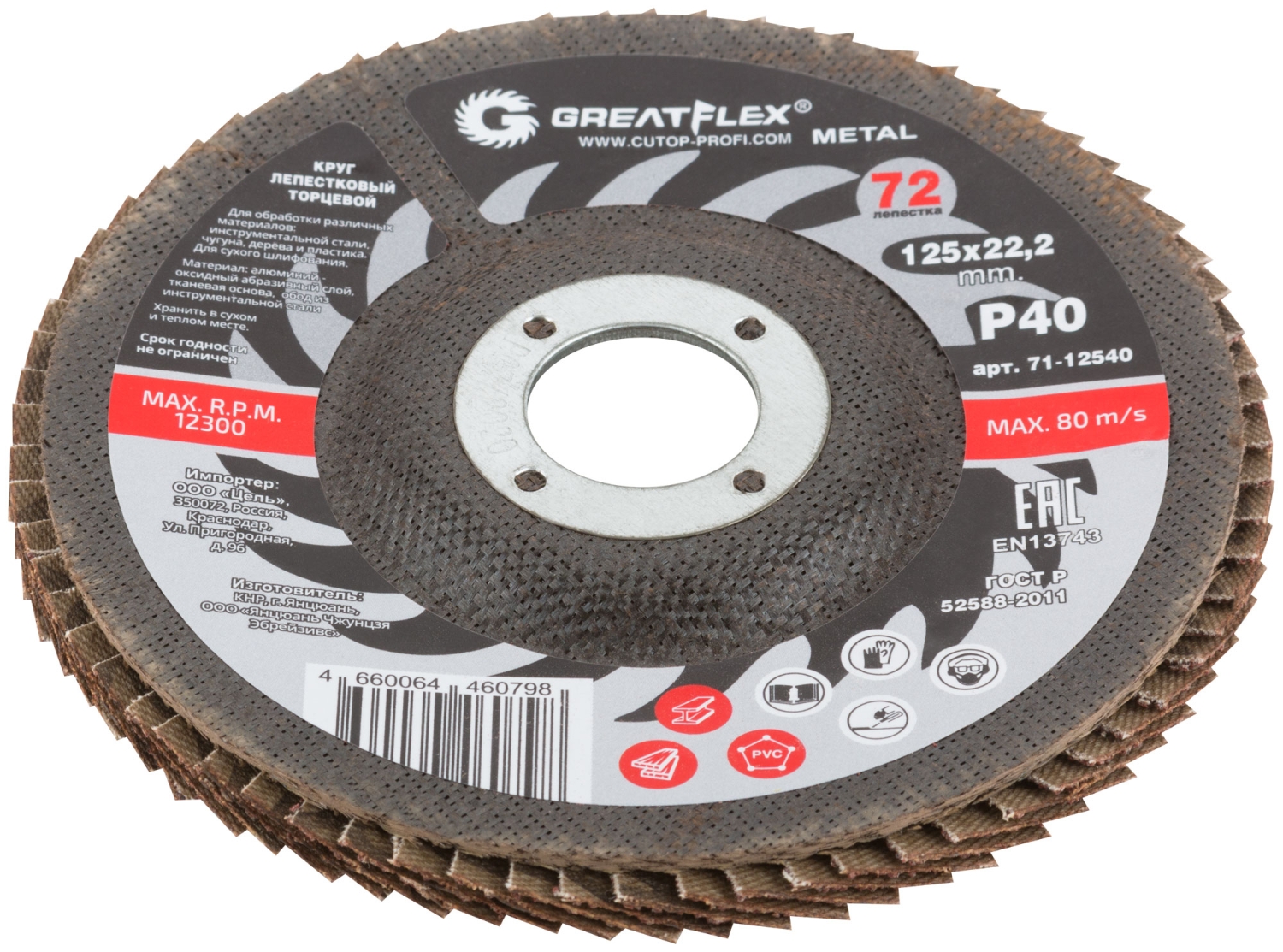 Круг класса "МАСТЕР "для повседневного использования.При изготовлении используется гибкий абразивный материал состоящий из тканевой основы на которую нанесен оксида алюминия --Корунд,Произведено с использованием технологии и контролем качества CUTOP.Наполняемость диска составляет 72 лепестков с углом наклона 10 градусов, что позволяет увеличить площадь контакта обрабатываемой поверхности и КПД круга Предназначен для обработкт металла . Для углошлифовальных машин. Посадочный диаметр 22,2мм