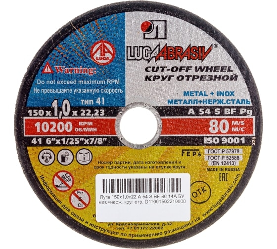 | Круг отрезной мет+нерж 125х1,0х22 мм A 54 S BF 80 Луга | D11001252210000 | 1 шт. |