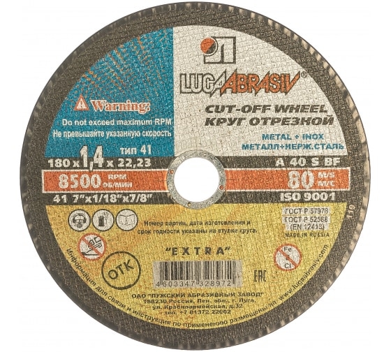 Круг отрезной мет+нерж 180х1,8х22 мм A 40 S BF 80 Луга D11001802218000 1 шт.