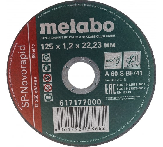 | Круг отрезной по металлу 125х1,6х22,2 мм МЕТАВО | 617178000 | 1 шт. |