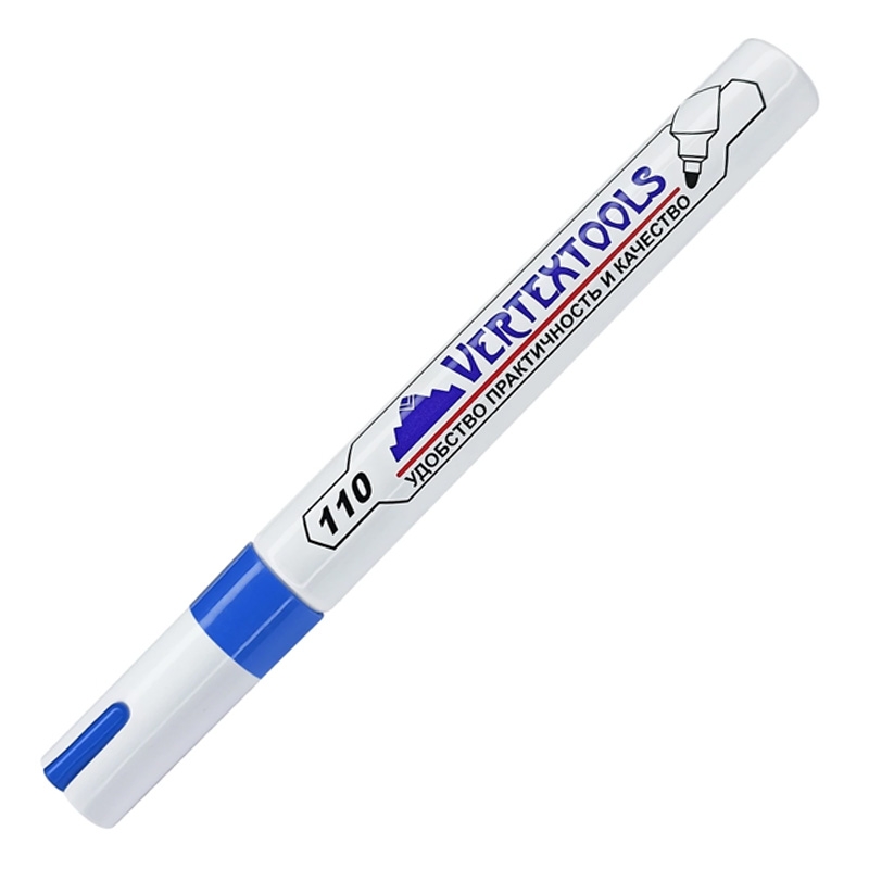 Маркер краска строительный, синий используется для нанесения надписей на стекло, металл, бетон, пластик, дерево, текстиль, резину, включая влажные, шершавые, масляные, пористые поверхности. Не выгорает на солнце. Краска устойчива к механическим воздействиям. Толщина линии - 4 мм.