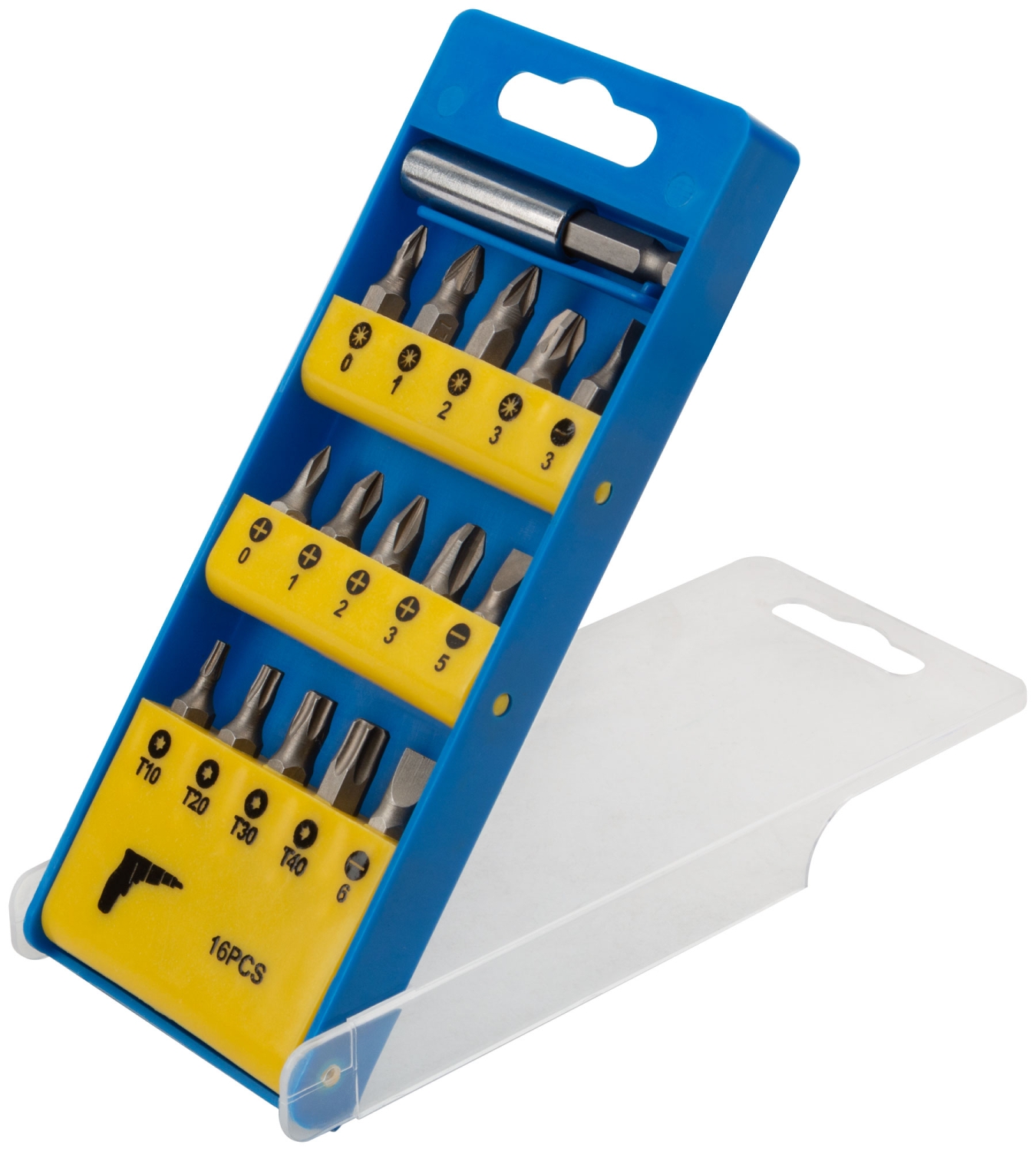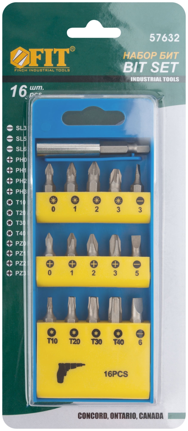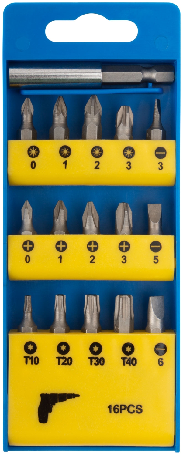 В наборе 15 бит из хром-ванадиевой стали (25 мм): SL3, SL5, SL6, PH0, PH1, PH2, PH3, T10, T20, T30, T40, PZ0, PZ1, PZ2, PZ3. Магнитный адаптер для бит (60 мм). Упаковка: пластиковая коробка в блистере.