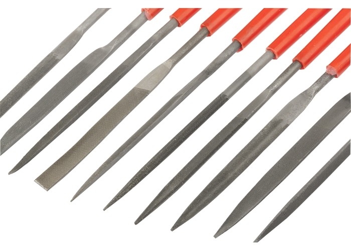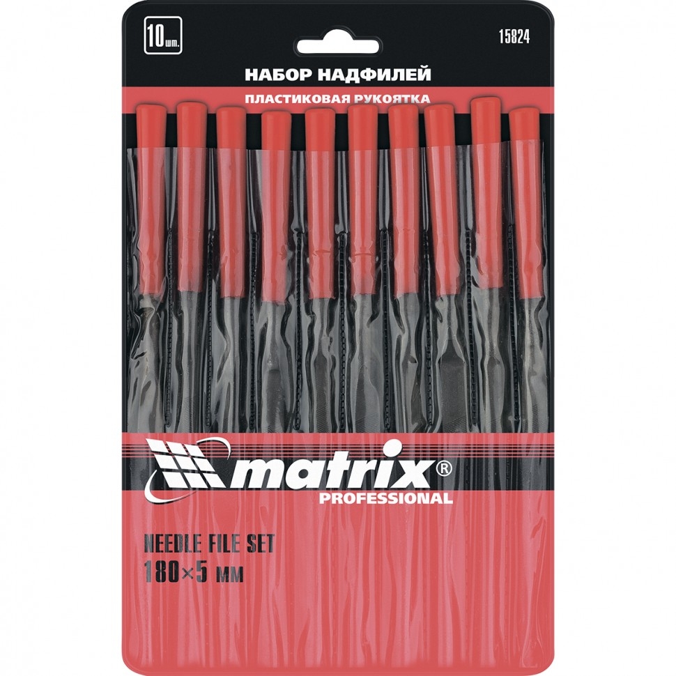 Набор надфилей Matrix 15824 из 10 шт., 180 x 5 мм, с пластиковыми рукоятками, состоит из инструментов для опиловки и зачистки мелких деталей. Поскольку входящие в комплект надфили имеют разные профили, он подходит для обработки изделий сложной формы. Инструменты будут полезны при проведении слесарных и столярных работ, пригодятся также дома или в гараже. Преимущества Долговечность — надфили изготовлены из конструкционной подшипниковой стали, поэтому характеризуются высокой износостойкостью. Комфорт во время работы — инструменты имеют удобные пластиковые рукоятки. Высокое качество обработки — на полотна нанесена двойная перекрестная насечка. Удобный поиск — благодаря красному цвету рукояток надфили не затеряются в рабочем пространстве.