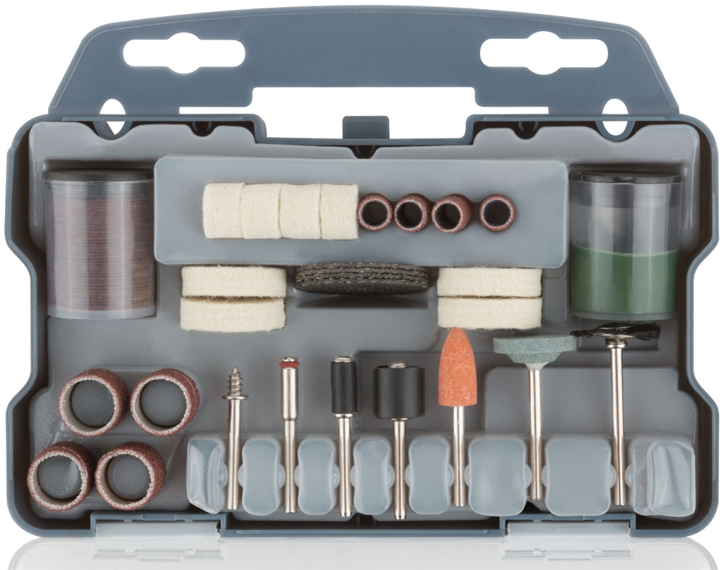 Для гравировальной машины. Для обработки различных материалов. В наборе: трубки наждачные, круги войлочные, насадки войлочные, круги отрезные, шарошки абразивные, шарошки алмазные, корщетки нейлоновые, паста полировальная, патроны цанговые, держатели для полировальных насадок и наждачных трубок. Упаковка: пластиковая коробка.