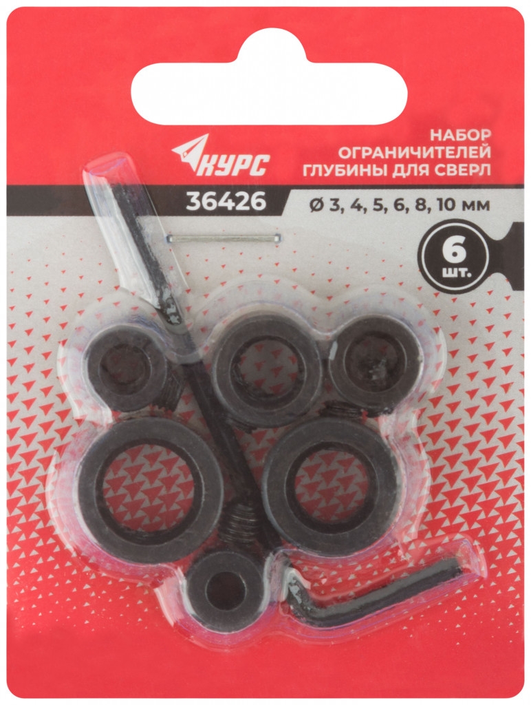 Стопперы для сверел, набор 6 шт. (3, 4, 5, 6, 8, 10 мм) с шестигранным ключом 2,5 мм в комплекте. Для ограничения глубины сверления. Материал: инструментальная сталь с черненым покрытием. Упаковка: блистер.