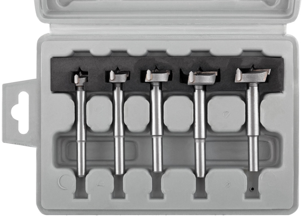 Сверла Форстнера, набор 5 шт. Для точного сверления сквозных и глухих отверстий в древесине и пластике. Материал: легированнаям инструментальная сталь, карбидные вставки. Упаковка: пластиковая коробка.