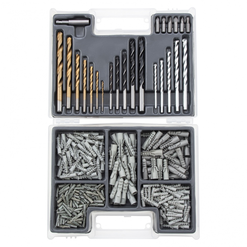 Комбинированный набор Matrix 72577 — универсальное решение для мастеров, т.к. он содержит 300 предметов: дюбели, отверточные биты, сверла по дереву 4-10 мм, сверла по бетону 4-10 мм и сверла по металлу 2-10 мм. Оснастка рассчитана на бытовое использование. Прочность и долговечность — биты выполнены из стали 45Х, сверла по дереву — из углеродистой стали, а сверла по металлу — из быстрорежущей стали HSS.