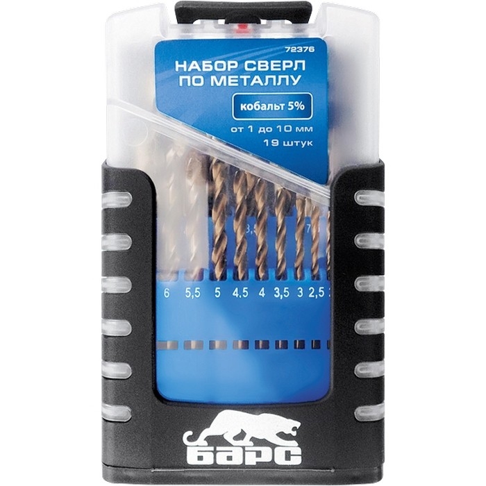 Набор Барс 72374 включает 19 сверл по металлу диаметром 1-10 мм (через 0,5 мм), из стали P6M5, с вышлифованным профилем и цилиндрическим хвостовиком, в боксе. Их используют для сверления отверстий в легированных, цветных и тяжелых металлах. В комплекте оснастки самых ходовых размеров, которые будут полезны во время слесарных работ, а также пригодятся дома, на даче или в гараже. Сверла изготовлены из быстрорежущей стали, содержащей вольфрам и молибден, поэтому устойчивы к перегреву и динамическим нагрузкам,
