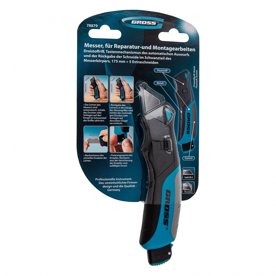 Ремонтно-монтажный нож Gross 78879 длиной 175 мм, с кнопочным автоматическим выбросом и возвратом лезвия, трехкомпонентной рукояткой и 5 запасными лезвиями, поможет раскроить линолеум или обои, разрезать картон, тонкий пластик, кожу, провода. Удобен в использовании — выброс лезвия и его возврат происходят автоматически при нажатии на кнопку с тыльной стороны корпуса. Нож является инструментом профессионального назначения, также будет полезен в быту. Износостойкость — режущая кромка долго не тупится, т.к. полотно изготовлено из высокотвердой японской стали SK-2 толщиной 0,6 мм.