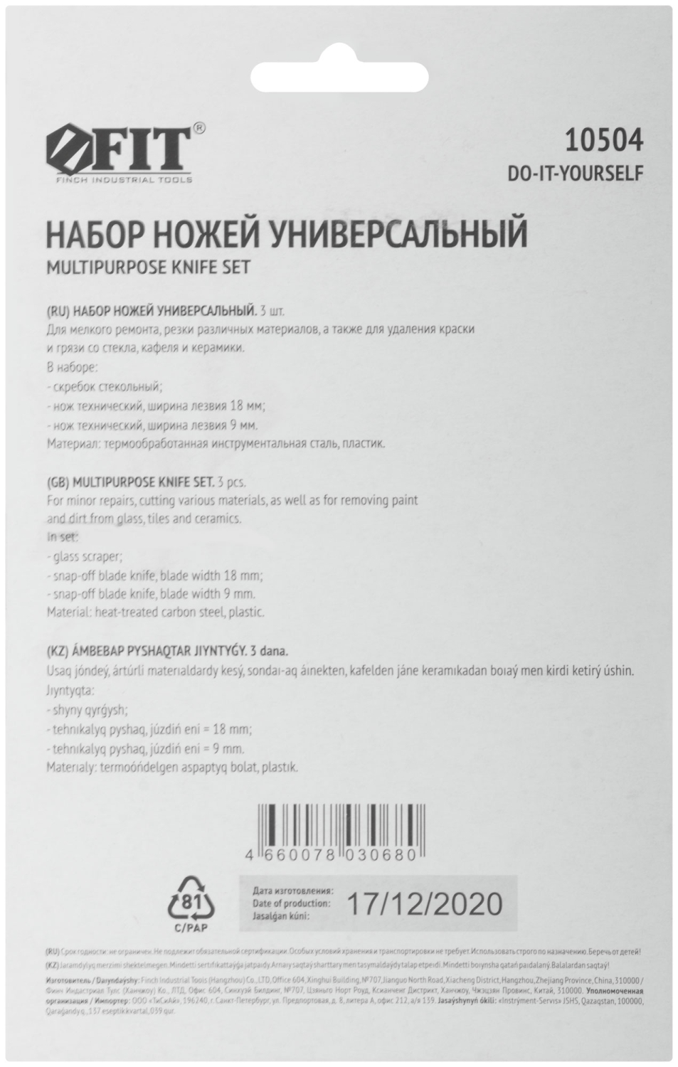 Набор универсальный. Для мелкого ремонта, резки различных материалов, а также для удаления краски и грязи со стекла, кафеля и керамики. В наборе: скребок стекольный, нож технический 18 мм, нож технический 9 мм. Материал: инструментальная сталь, пластик. Упаковка: блистер.