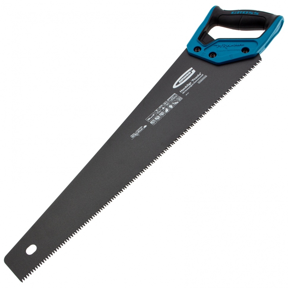Ножовка по дереву Gross PIRANHA 24115 с полотном длиной 500 мм, калеными зубьями с 3D-заточкой и шагом 7 TPI, с тефлоновым покрытием полотна и 2-компонентной рукояткой, используется для продольного и поперечного распиливания древесины различных пород, МДФ, ДСП, ДВП, ламината, а также пенополистирола, полиуретана и других синтетических материалов. Рабочая часть состоит из крупных зубьев поэтому ножовка подходит для решения широкого спектра задач. Трехгранная заточка зубьев увеличивает производительность инструмента без потери качества распиловки. Ножовка предназначена для столярных работ. Полотно изготовлено из японской пружинной стали SK-5, поэтому характеризуется высокой прочностью и устойчивостью к нагрузкам.