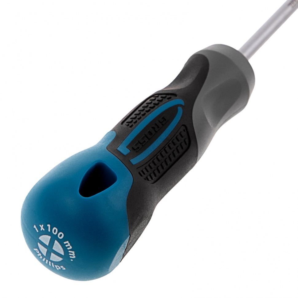 ОтРукоятка отвертки GROSS PH1x100мм, S2, трехкомпонентная ручка 12140 изготовлена из трехкомпонентного материала, имеет эргономичную форму и разработана с использованием последних технологий.верстие на рукоятке используется для подвеса инструмента.
