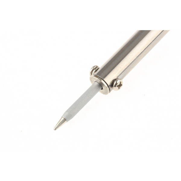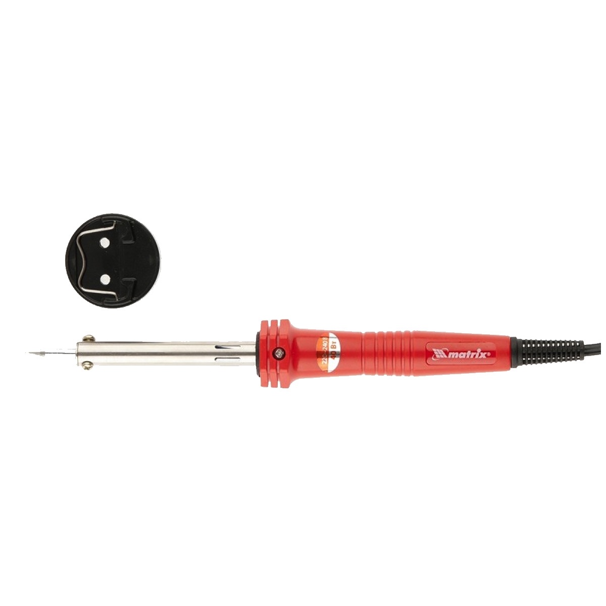 Паяльник Matrix 913034, 220 В, 40 W, изготовлен из ABS-пластика с пониженной теплопроводностью и имеет медный наконечник с долговечным покрытием. Используется для пайки транзисторов, микрочипов, электросхем и проводов. В качестве нагревательного элемента использована нихромовая спираль, что снижает риск поломки в случае падения или удара. Конусовидное жало оптимально для проведения точной пайки. Гальваническое покрытие защищает наконечник от внешних воздействий, что продлевает срок службы инструмента. Паяльник пригодится радиолюбителям и домашним мастерам. Преимущества Жало с медным сердечником быстро нагревается. Хромированное покрытие предохраняет жало от ржавчины и улучшает прилипание припоя. Легкая удобная ручка из термостойкого пластика обеспечивает комфорт во время работы. Съемное жало при необходимости можно заменить. Паяльник комплектуется подставкой для безопасного размещения на рабочем столе. Инструмент изготовлен в соответствии с требованиями ТР ТС 004/2011 и ТР ТС 0020/2011.