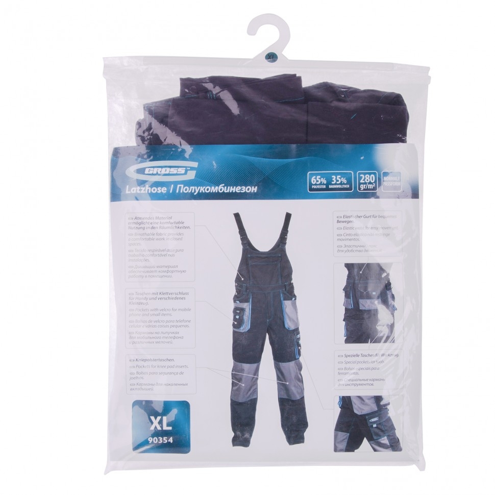 Полукомбинезон Gross 90354 размера XL рассчитан на рост 185-188 см и предназначен для защиты рабочего от механических повреждений, ветра и пыли. Может применяться в отапливаемых помещениях или на улице в теплое время года. Изготовлен из смесовой ткани с 35%-м содержанием хлопка, которая не препятствует воздухообмену, поэтому в полукомбинезоне комфортно работать. На 65% ткань состоит из полиэстера, что обеспечивает износостойкость спецодежды. В 14 карманах можно разместить инструменты и необходимые мелочи. Полукомбинезон необходим строителям, электрикам, садовникам, сотрудникам автосервисов, а также рабочим других специальностей. Эластичный пояс комфортно прилегает к телу, не сковывая движений. Имеются карманы на липучках, поэтому мобильный телефон и другие мелкие предметы не потеряются. Специальные нашивки с водоотталкивающей пропиткой защищают боковые карманы от истирания, продлевая срок службы полукомбинезона. На коленной части предусмотрены карманы для амортизационных вкладышей.