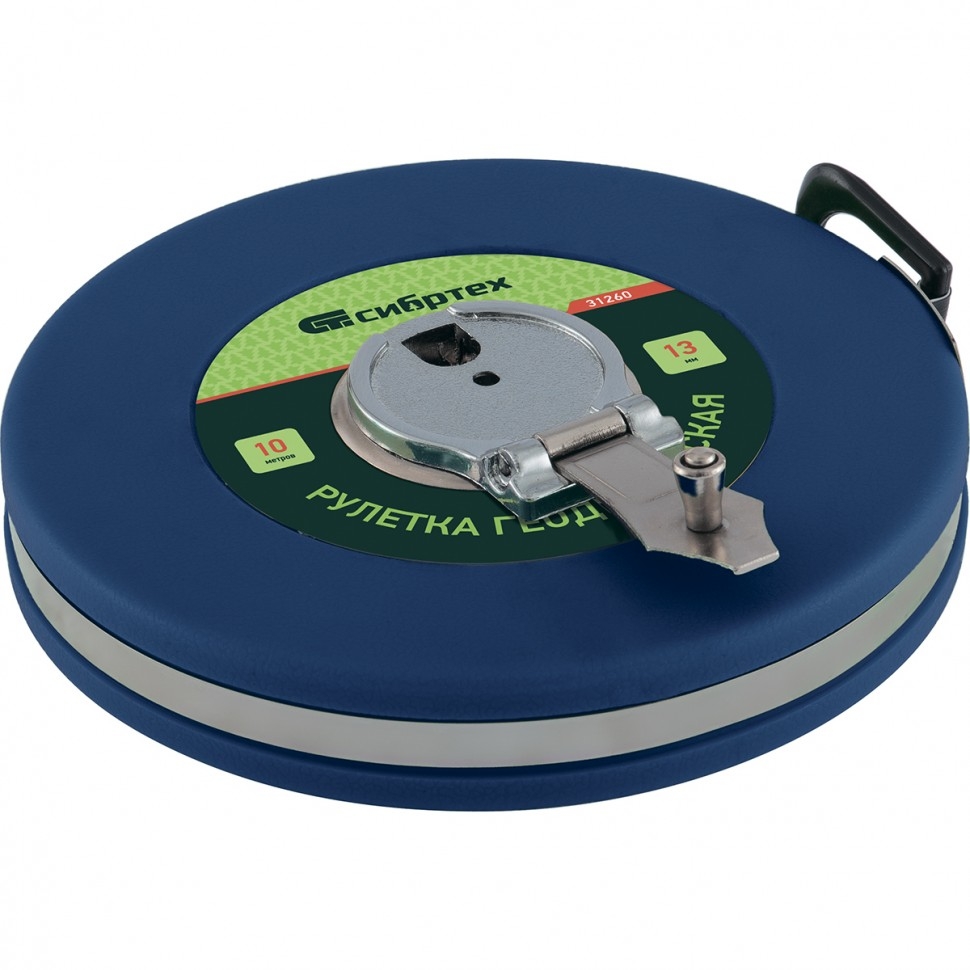 Геодезическая рулетка Сибртех 31260, 10 м х 13 мм, в закрытом корпусе, с фибергласовой лентой, — измерительный инструмент для определения расстояний и проведения замеров различных объектов. Закрытый корпус из прочного ABS-пластика, усиленный стальной лентой, обеспечивает инструменту повышенную стойкость к механическим воздействиям. Рулетка пригодится при выполнении строительных и ремонтных работ, обмеров садовых участков, а также при формировании ландшафтов. Фибергласовое измерительное полотно не подвержено коррозии и устойчиво к повреждениям, что продлевает срок службы инструмента. Складной стальной зацеп фиксирует конец ленты на объекте, что облегчает проведение измерений. Возвратный механизм открывается нажатием кнопки, поэтому инструмент удобен в эксплуатации.