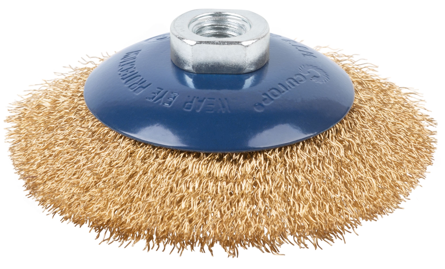 Щетка для УШМ, тип «Тарелка», посадка М14. Предназначена для очистки различных металлических и деревянных поверхностей, снятия толстого слоя ржавчины, удаления лакокрасочных покрытий, заусенцев и окалины, обработки сварных швов, различных загрязнений. Тип «Тарелка» оптимально подходит для обработки углов, пазов, изгибов и других труднодоступных участков. Щадящая зачистка, латунированная проволока 0,3 мм.