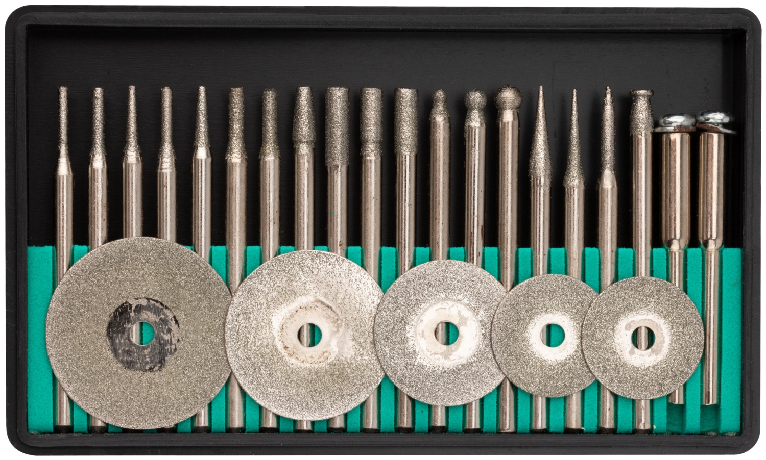 Для обработки и резки мрамора, бетона, керамики, дерева, металла и др. материалов. Для работы с гравировальной машинкой. В комплекте: Круги алмазные отрезные: 16 мм, 18 мм, 20 мм, 22 мм, 25 мм. Шарошки алмазные: 18 шт. Штифт D 3 мм: 2 шт. Материал: инструментальная сталь, режущая кромка содержит порошок из технических алмазов. Упаковка: блистер.