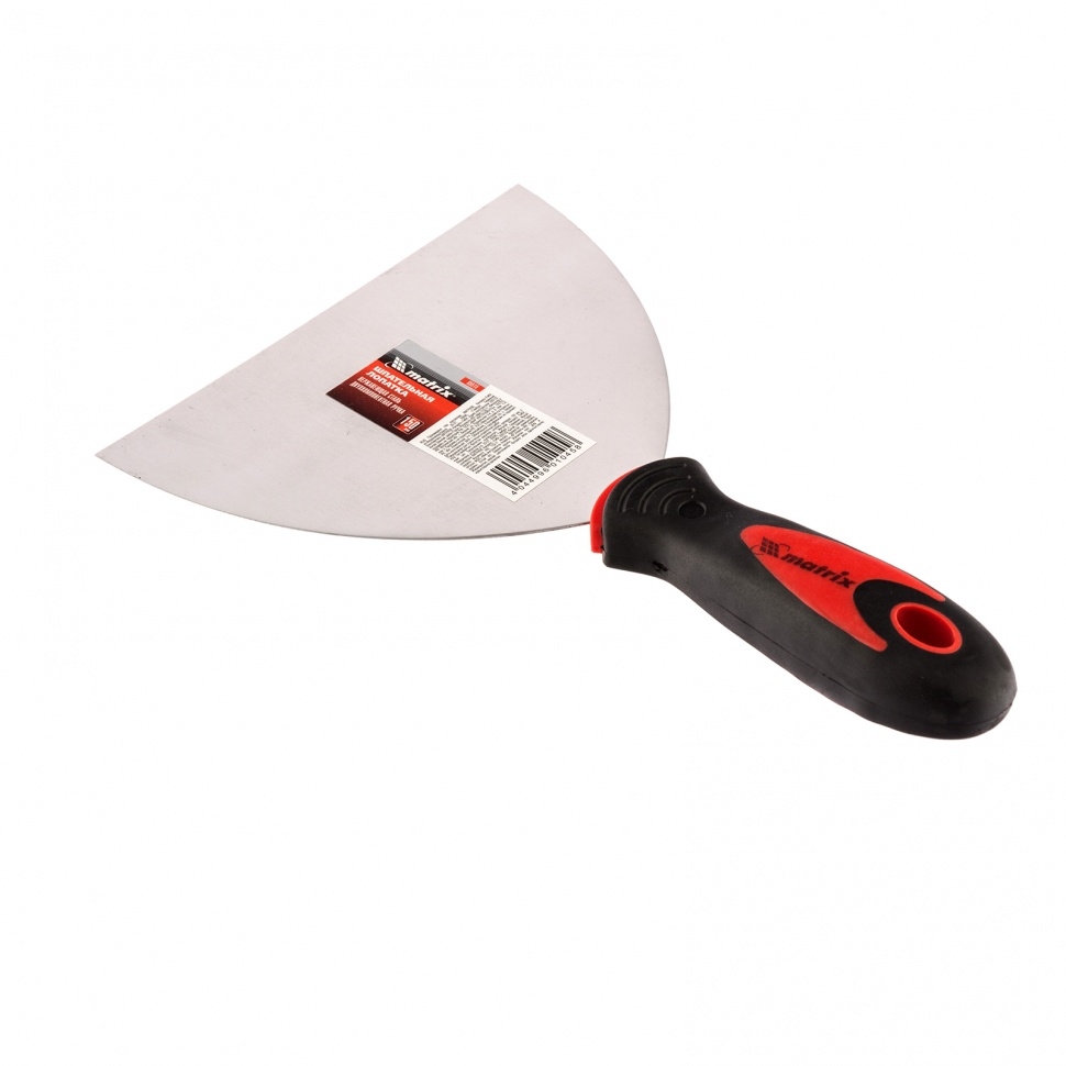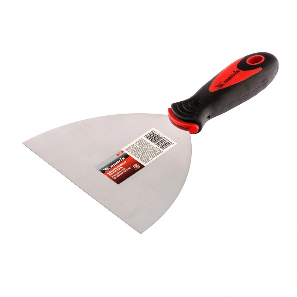 Шпательная лопатка из нержавеющей стали Matrix 85515, шириной 150 мм, с 2-компонентной ручкой, предназначена для нанесения и выравнивания строительных смесей, шпаклевания швов, заполнения трещин, удаления старых обоев. За счет компактных размеров инструмент подходит для корректировки мелких трещин и неровностей.