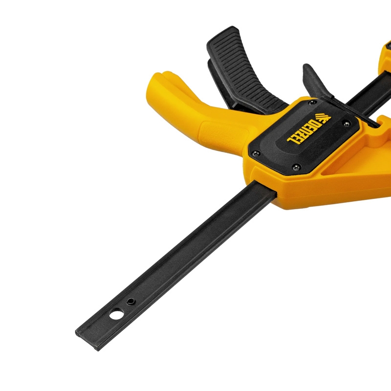 Струбцина весит всего 290 г, а обрезиненная кнопка фиксации обеспечивает удобный захват, что делает её комфортной в использовании. Инструмент подходит как для бытовых, так и для профессиональных задач.