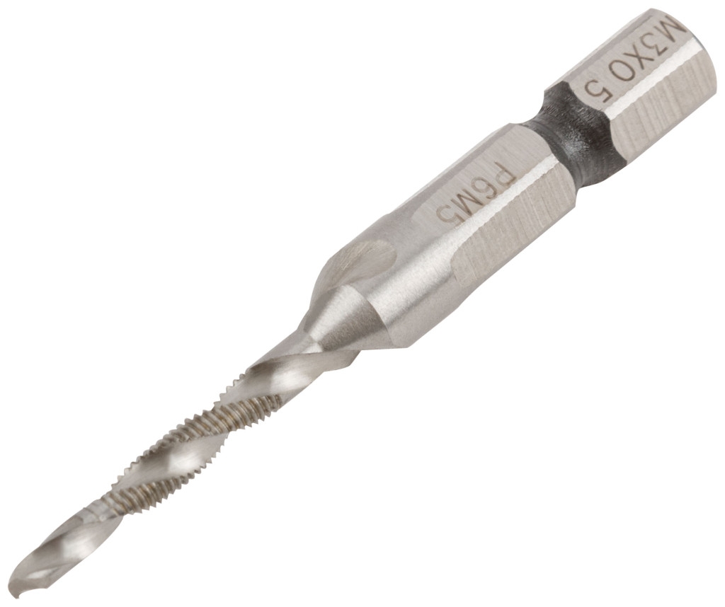 Сверло-Метчик комбинированное метрическое. Для сверления отверстий и нарезания резьбы в легированных и нелигированных сталях, цветных металлах и чугуне. Шлифованный профиль, правостороннее, метрическая резьба. Шестигранный U-образный хвостик. Материал: быстрорежущая (HSS) сталь P6M5. Упаковка : блистер.