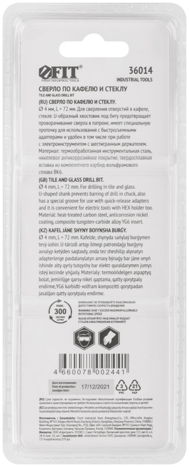 Сверло по кафелю шестигранный U-хвостовик под биту, 4 мм