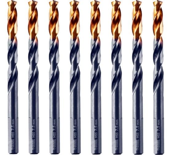 Сверло по металлу Golden Tip 7.5 мм, HSS-Tin, 8 шт, DIN 338 Denzel 717218 предназначено для сверления сквозных и глухих отверстий в легированной и нелегированной стали, железе, чугуне, листовом и цветном металлах, пластмассе.