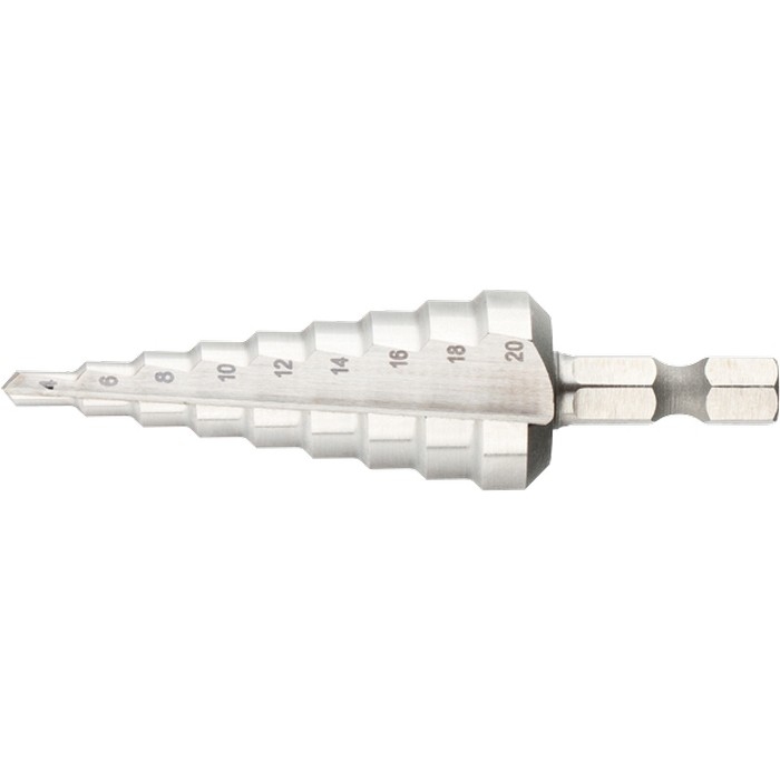 Сверло ступенчатое 4-6-8-10-12-14-16-18-20 мм,по мет..Р6М5,шестигр.хв.Барс
