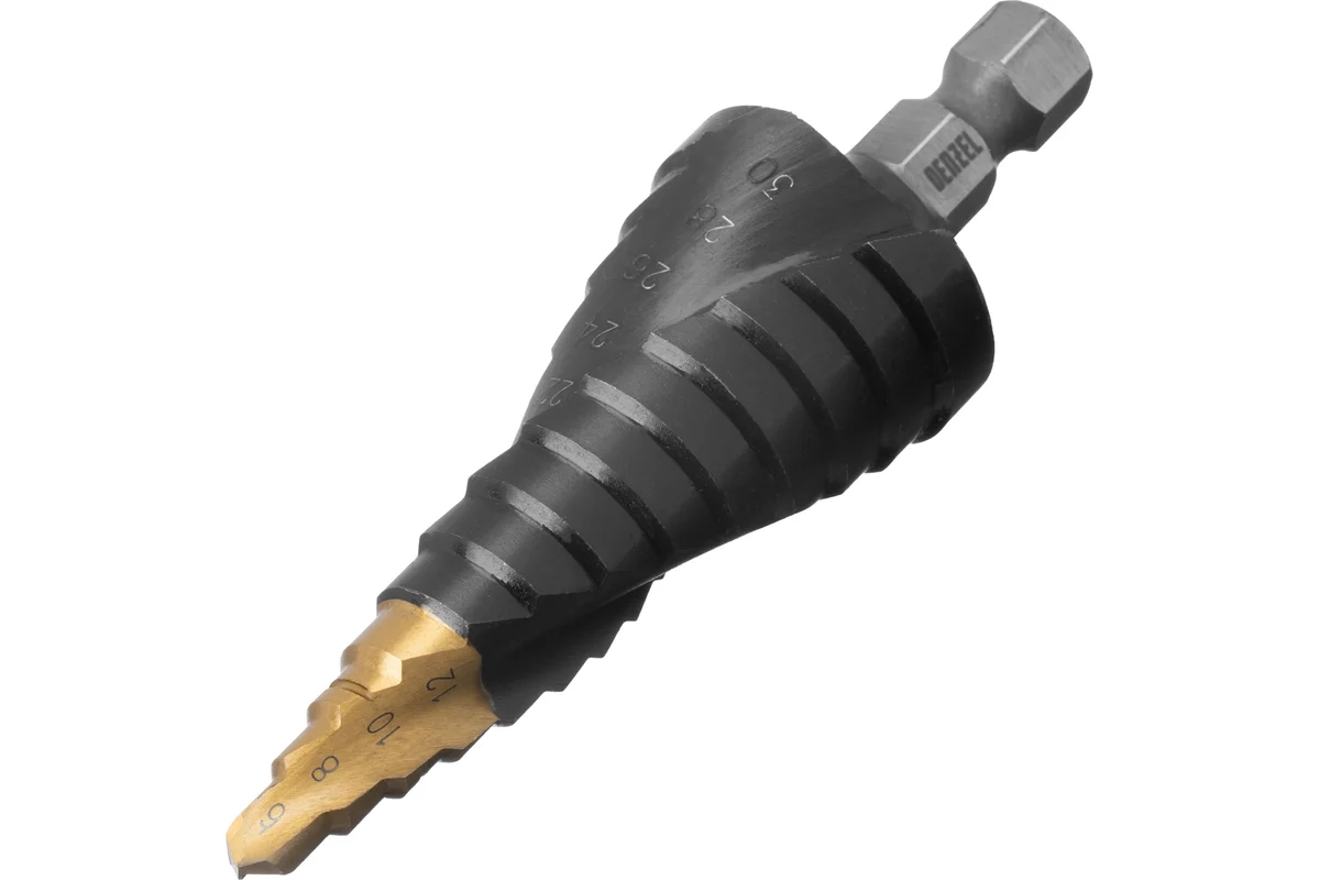 Сверло ступенчатое 6-8-10-12-14-16-18-20-22-24-26-28-30 мм,Р6М5,шестигр.хв.Denzel